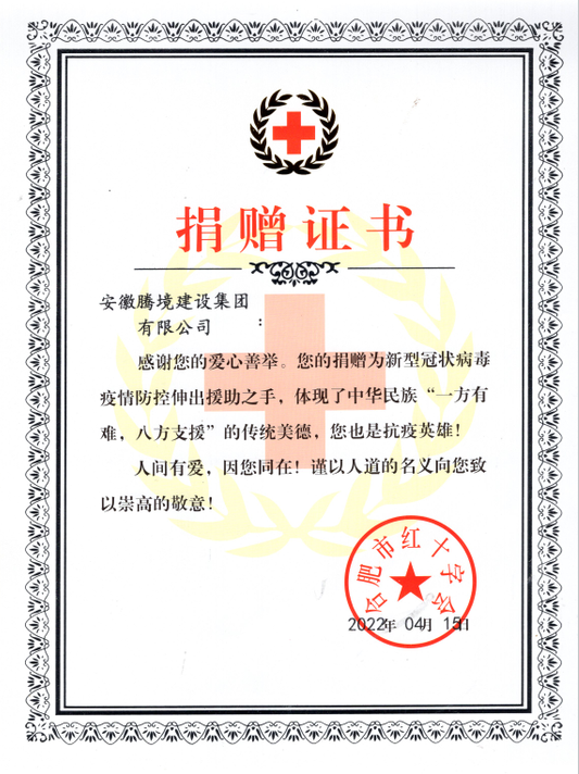 4月13日,安徽腾境建设集团有限公司先后向安徽省红十字会、合肥市红十字会捐赠爱心善款贰万圆整,为支援抗疫一线,助力本地防疫工作,以实际行动奉献爱心,为打赢这场疫情防控阻击战贡献自己的力量。