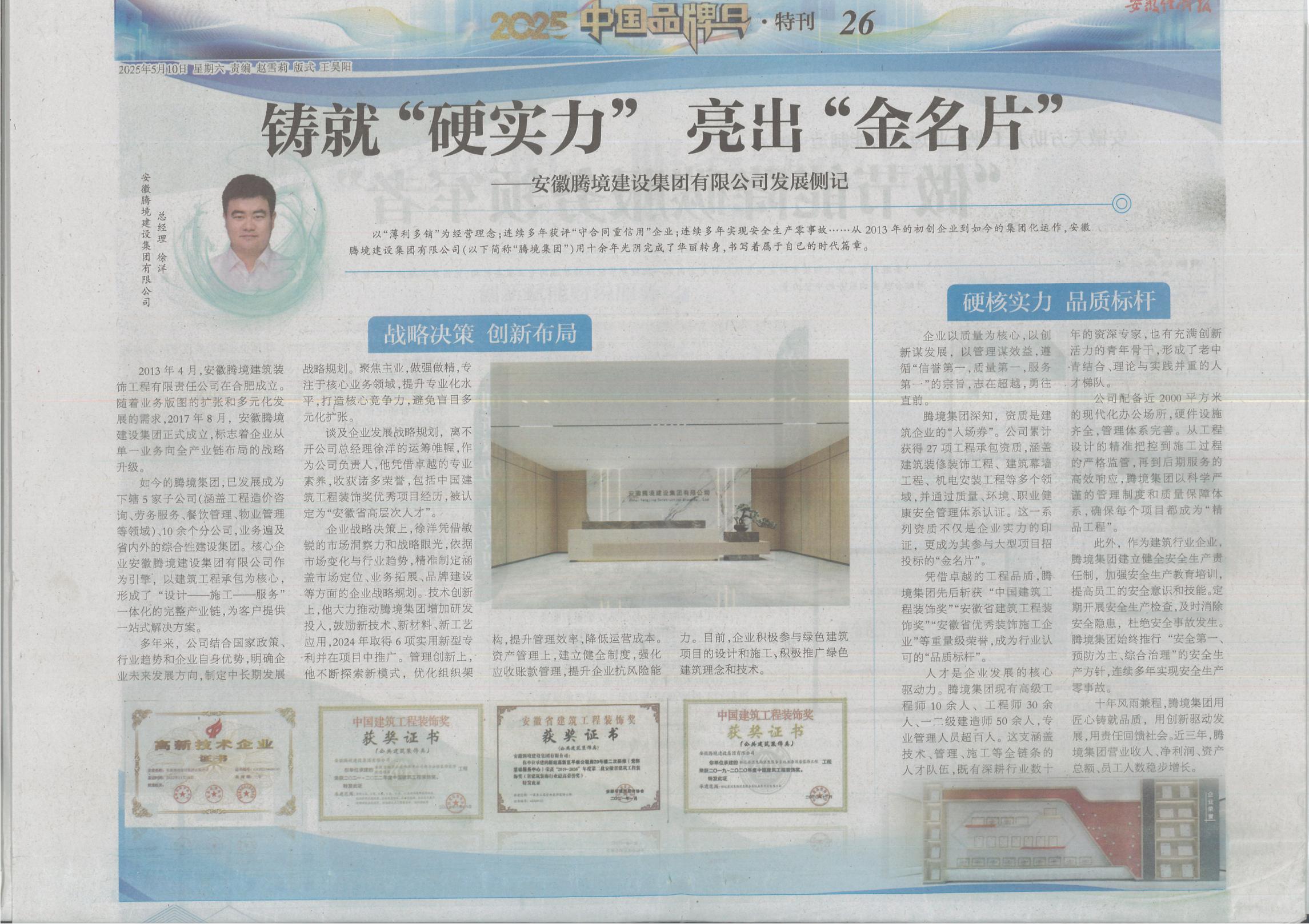 作为安徽省装饰行业的领军企业,腾境集团始终以技术创新和质量管理为核心竞争力。近年来,公司聚焦多种技术,成功打造多个国家级、省级示范工程。此次获评“先锋企业”,正是对其以创新赋能传统建筑业转型升级的认可。《安徽经济报》特刊专辑以专题形式报道其发展经验,为行业提供了可借鉴的“腾境模式”。