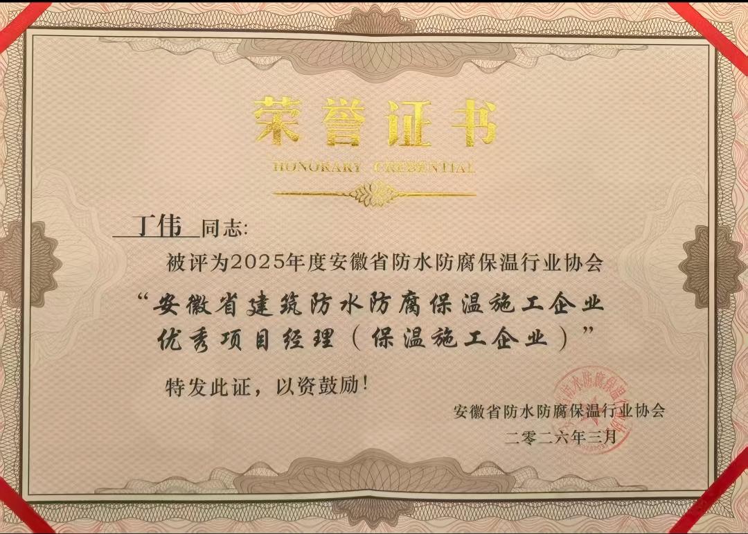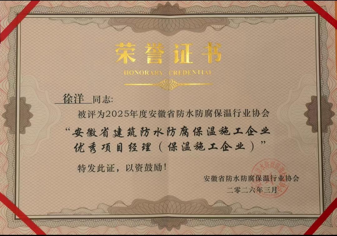 大会同步表彰了行业内优秀项目管理人才,腾境集团总经理徐洋、丁伟两位同志凭借精湛的专业技术、严谨的项目管理能力与出色的工程实绩,双双荣获“安徽省建筑防水防腐保温施工企业优秀项目经理(保温施工企业)”称号。