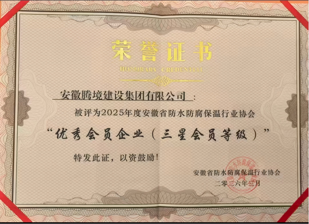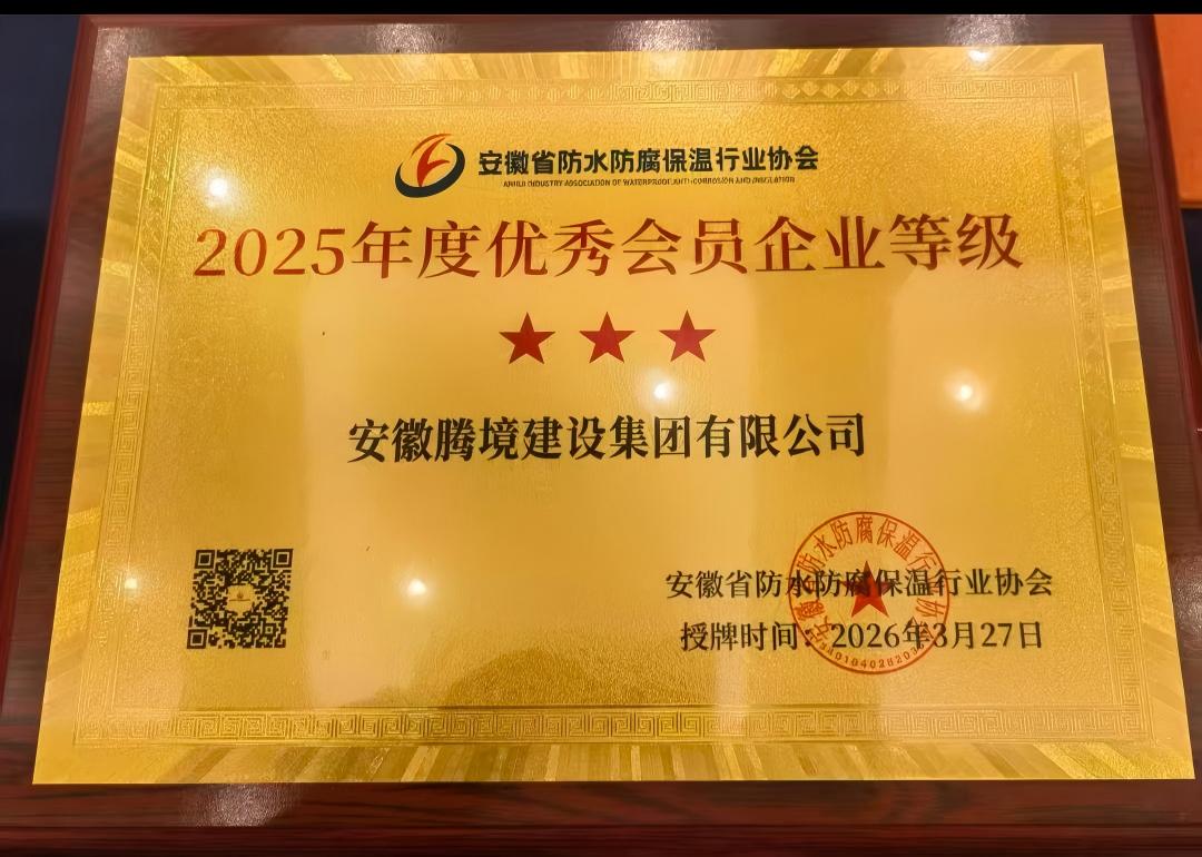 这一荣誉是安徽省防水防腐保温行业协会对公司深耕防水防腐保温领域、推动行业高质量发展的高度认可,标志着腾境集团在行业内树立起优质标杆形象,综合实力稳居行业前列。